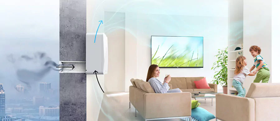 Для вентилирования в пару к напольному кондиционеру рекомендуется приобретать бризер. Примечательно, что это компактное устройство может работать при закрытых окнах. Бризер не только забирает воздух с улицы, но и тщательно очищает его от мелкодисперсных частиц, загрязнений. Очищает он и те потоки, которые циркулируют внутри помещения — от пыли, частичек человеческой кожи, шерсти домашних питомцев.