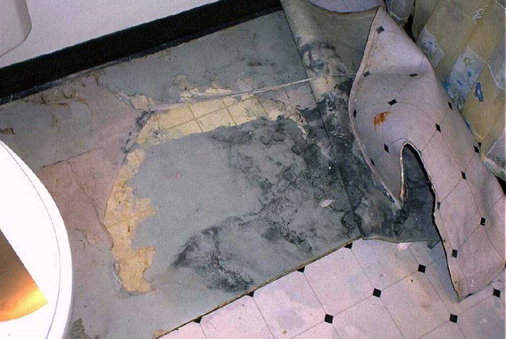 Демонтажа старого покрытия. Перед тем как стелить линолеум в ванной комнате, нужно полностью удалить старое покрытие.