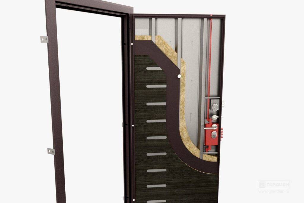 Металлические варианты дверей этого класса защищены тонкими пластинами из металла (до 1,5 мм толщиной). Обеспечить звукоизоляцию и удержание тепла помогает гофрированный картон.