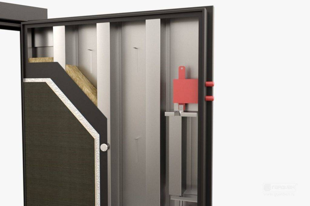 - Внутри имеются П-образные ребра жесткости из стальных элементов. Они повышают надежность двери, скрепляют внутреннюю обшивку с наружной.