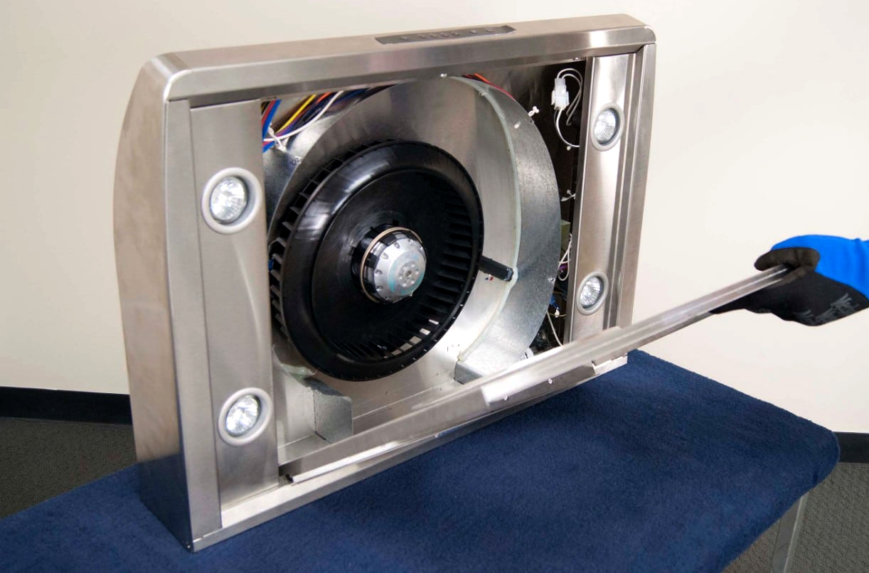 Основные элементы рециркуляционной системы являются вентилятор и двигатель. Можно встретить формы вытяжек без отвода с несколькими двигателями. В корпусе они расположены между угольными фильтрами или над ними, если это навесные модели.