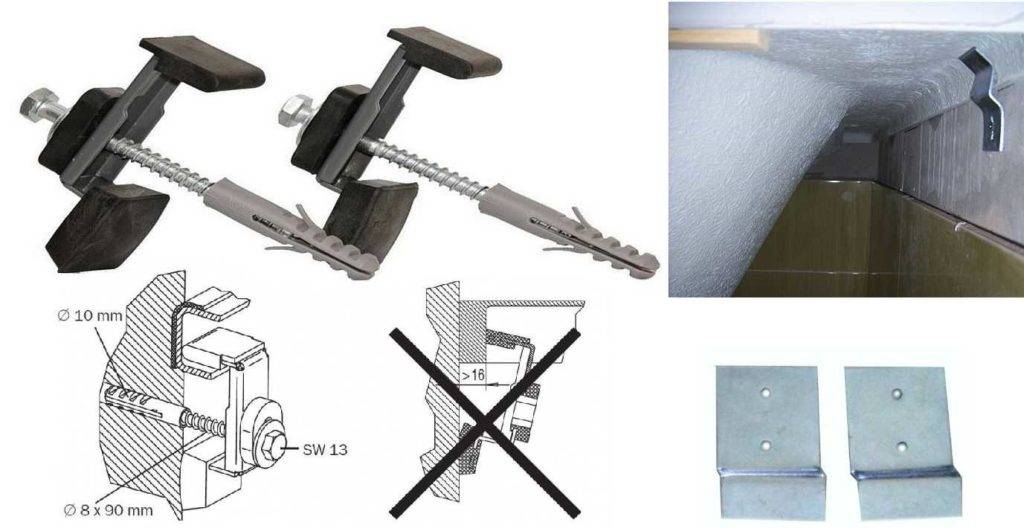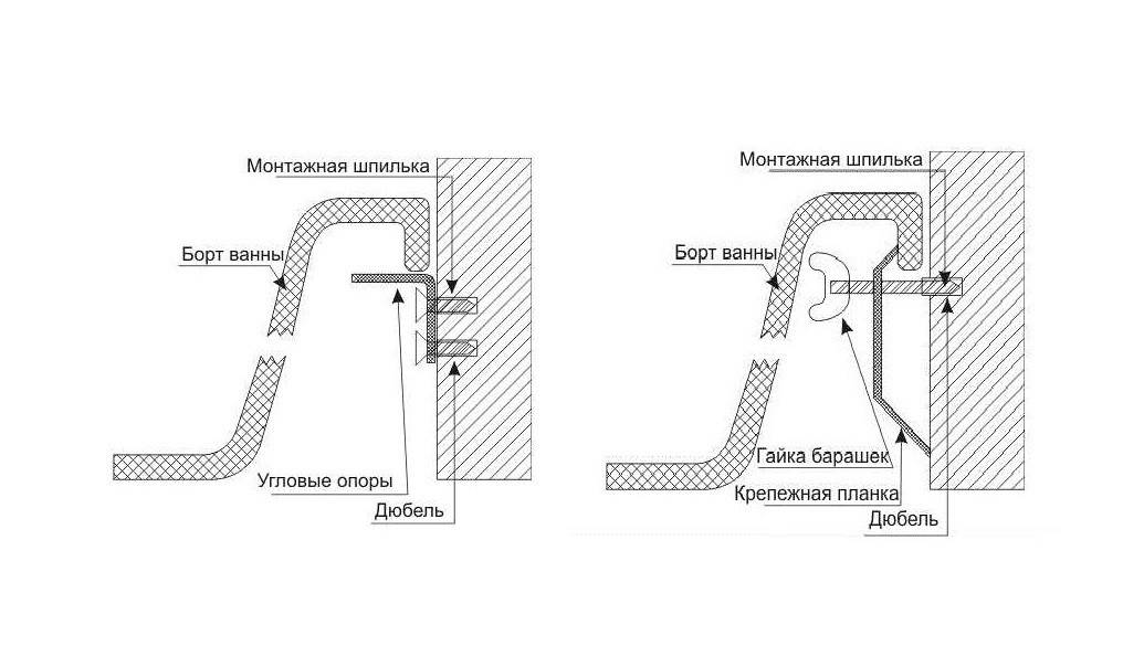 Наибольшей надежностью отличаются регулируемая самоклеящаяся конструкция-опора, которая повторяет изгиб днища ванны. Заводская комплектация оснащена опорными наконечниками, изготовленными из пластика. Высоту ванны от пола подгоняют с помощью регулировочных шпилек.
