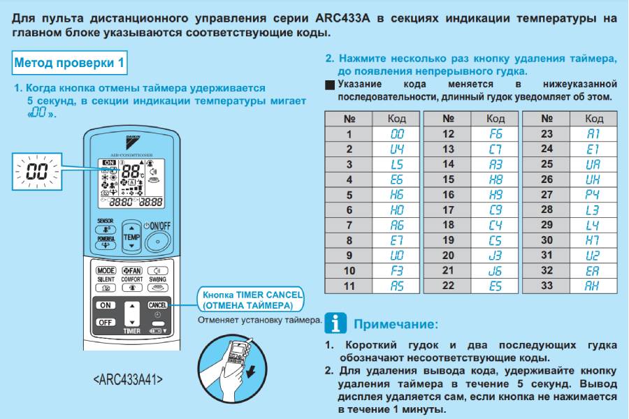 - После этого наведите пульт на кондиционер и нажимайте кнопку “cancel”, перелистывая список ошибок по очереди. На соответствующей ошибке из кондиционера раздастся длинный звуковой сигнал.