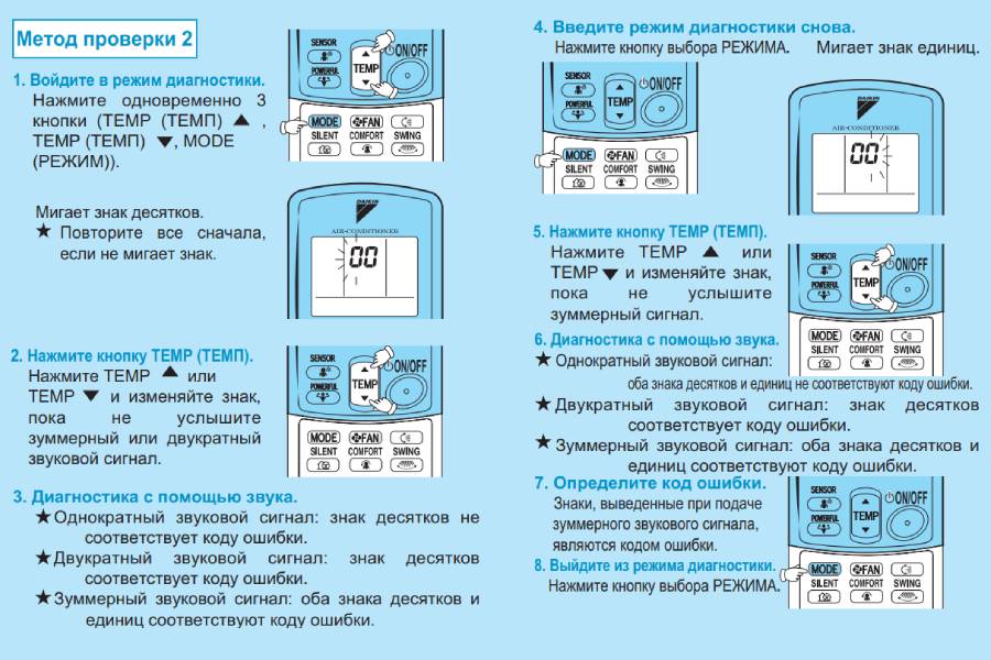 Кондиционеры Daikin имеют совершенную систему самодиагностики, которая при неисправности отключает кондиционер, а пользователю сообщает код ошибки, выводя его на экран пульта управления.
