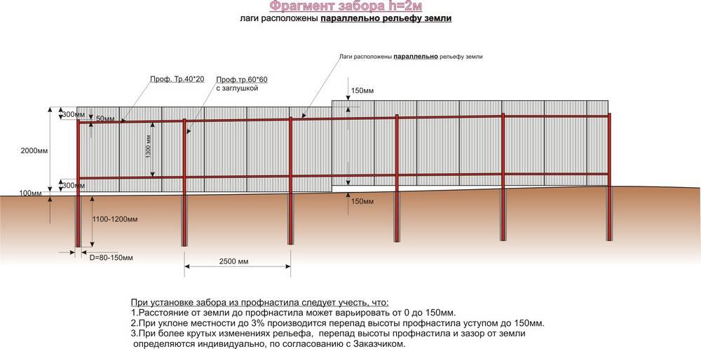 Ориентироваться на необходимое расстояние можно даже по стандартным параметрам профлиста для забора, который не превышает 2,5 м, даже при учете дополнительного припуска.