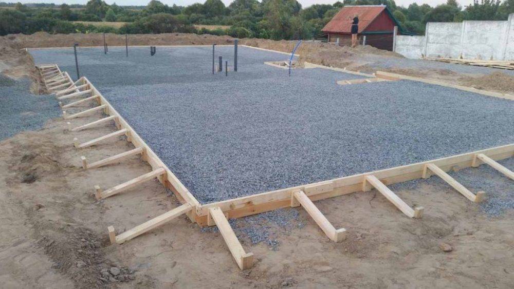 В грунте выкапывают котлован глубиной 40-50 см. На дно насыпают песок слоем толщиной 10-15 см, прокладывают его геотекстилем (рекомендуется). Сверху насыпают гравий. Иногда песок и гравий смешивают и делают общую засыпку. Далее укладывают гидроизоляцию, предназначенную для защиты поднимающихся грунтовых вод (2-3 слоя рубероида). Устанавливают опалубку по периметру конструкции. Затем укладывают арматурный каркас. Он рассчитывается с учетом размера и массы дома, поступающих нагрузок от грунта. Используемая арматура – d14 и более. Заливают бетонный раствор марки М300 и более
