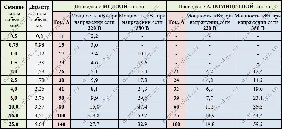 В данной таблице приведены значения для медных проводов кабелей, так как алюминиевые провода, на сегодняшний день, при монтаже электропроводки, практически никто не применяет.