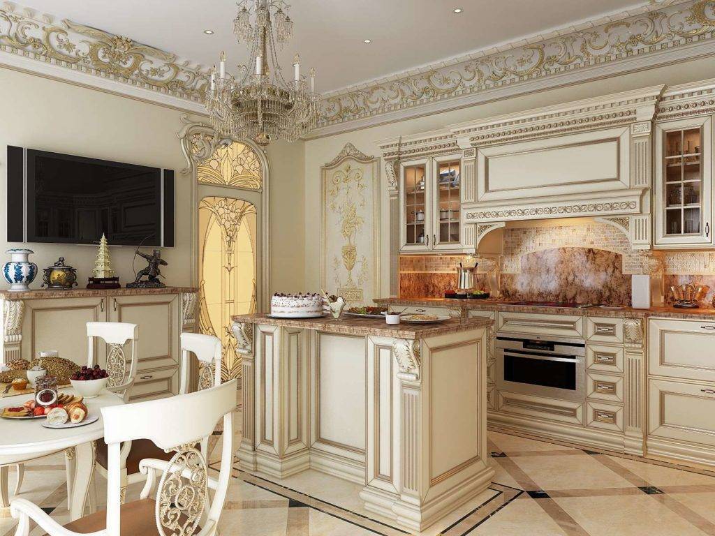 Как и в минимализме, в классике применяют светлые цвета — белый, бежевый, светло-серый. Потолок оформляют лепниной, часто дизайн дополняют фотопечатью с репродукцией классических картин.