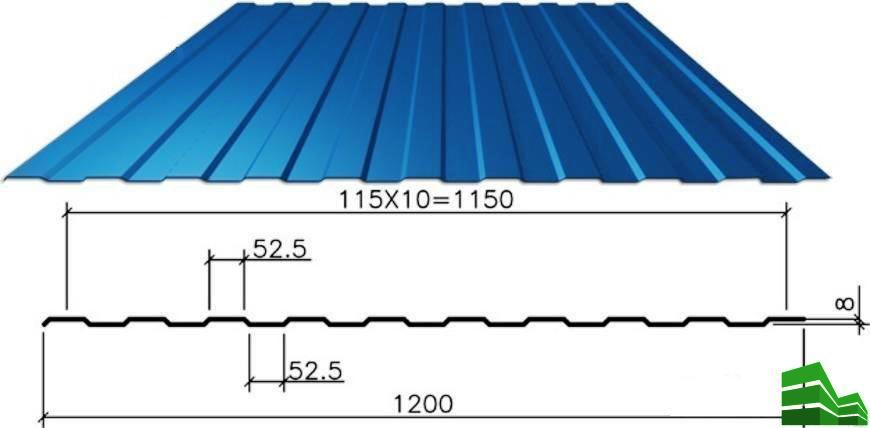 - марка С8: 115 и 120 см – значения полезной и полной ширины, 62,5 мм – шаг ребер, 8 мм – высота гофры;
