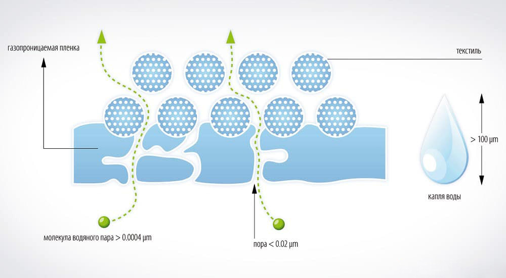 Мембрана состоит из нескольких слоёв плёнки с микроскопической перфорацией. Отверстия не способны пропустить водяную каплю, но легко пропускают пар. Внутри мембраны влага распределяется по всей площади, испаряется, или стекает вниз по внутренним каналам.