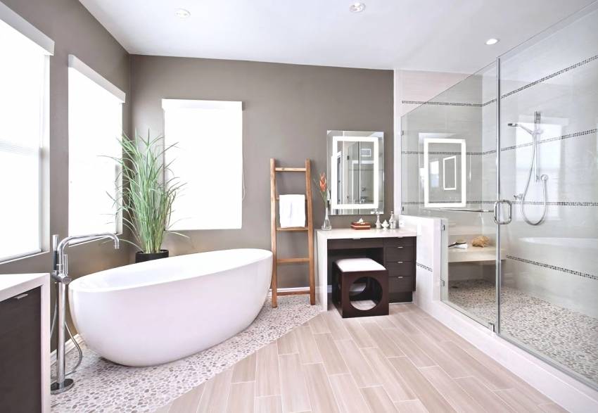 Просторное помещение предполагает монтаж любых моделей. Интересное решение – акриловые ванные круглой или овальной формы, расположенные по центру.