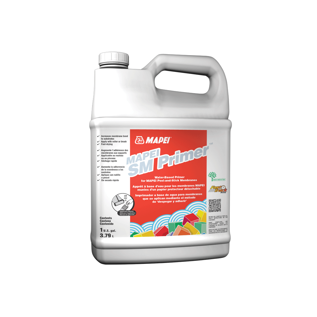 Water-Based Primer for MAPEI Peel-and-Stick MembranesMAPEI SM Primer is a ready-to-use, fast-drying, water-based, latex primer for use under MAPEI’s peel-and-stick sheet membranes on residential and commercial indoor or outdoor floors. MAPEI SM Primer greatly increases the bond of MAPEI’s peel-and-stick sheet membranes to concrete, plywood and other approved, properly prepared floors. It can be applied with a roller or brush, is white in color and dries clear.