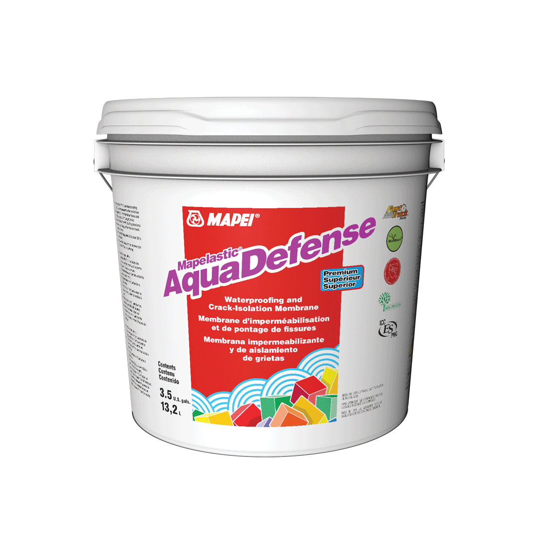 Premium Waterproofing and Crack-Isolation MembraneMapelastic AquaDefense is a premixed, advanced liquid-rubber, extremely quick-drying waterproofing and crack-isolation membrane for installation under ceramic tile or stone in residential, commercial and industrial environments. Mapelastic AquaDefense provides a thin, continuous barrier to protect adjacent rooms and floors below from water damage. For common problem areas like coves, corners, cracks and drains, it can be combined with MAPEI’s optional Reinforcing Fabric or Mapeband accessories (cove roll and drain flash) to provide additional protection. Mapelastic AquaDefense dries after about 30 to 50 minutes and is then ready to receive any MAPEI polymer or epoxy mortar. Mapelastic AquaDefense can be flood-tested after 12 hours of drying time, is IAPMO-listed for use as a shower-pan liner, and exceeds ANSI A118.10 and ANSI A118.12 standards.