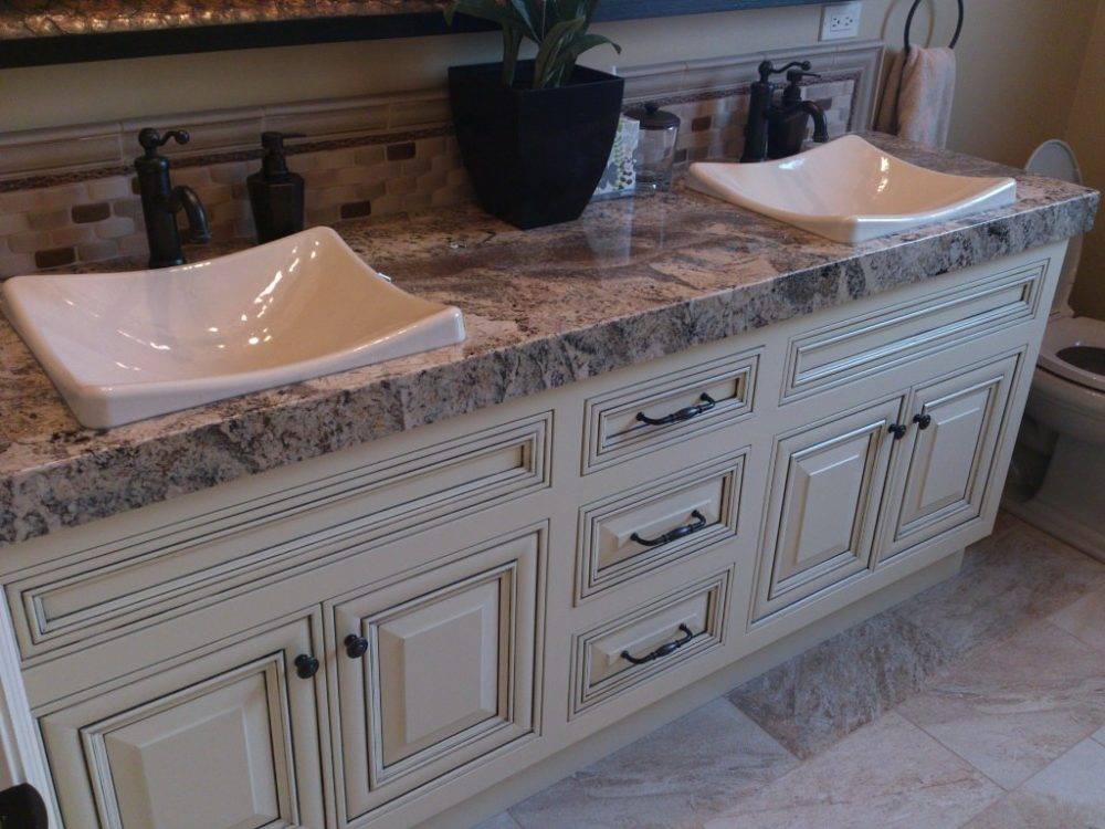 Гранитные столешницы для ванной стоят немного дороже мраморных, поскольку этот камень имеет более высокую плотность и его сложнее обрабатывать. По своим эстетическим параметрам он ничем не уступает своему собрату, за исключением менее изящного рисунка. Природные цвета гранита делают его применение ограниченным, поскольку палитра колеблется от светло-розового, до глубокого синего.