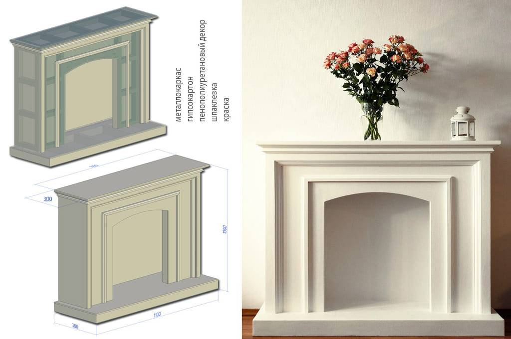 Если вы не обладаете необходимыми навыками или временем, можно сделать только каркас с нишей и приобрести готовый портал для камина из полиуретана, подобранный по размеру вашей топки.