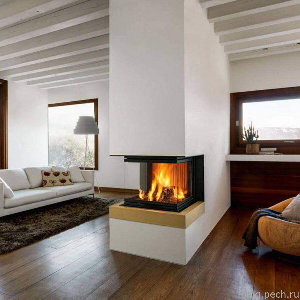 Как правило, топки с плоскими стёклами дешевле. Зато призматическое стекло расширяет угол обзора, чтобы любоваться огнём из разных точек комнаты, а не только находясь напротив камина.