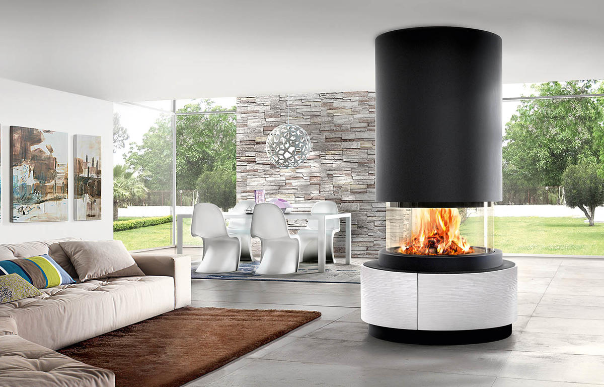 Островной камин из металла с поворотной топкой. Здесь топка закрыта стеклом. Если топка открытого типа, вокруг камина обязательно устраивается площадка из негорючего материала.