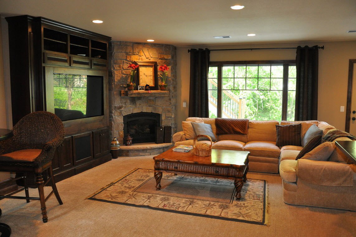 Угловой камин не занимает много места, но украшает и одновременно обогревает гостиную.