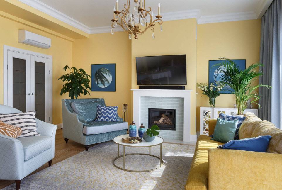 Выделить камин на фоне стены можно с помощью яркого цвета