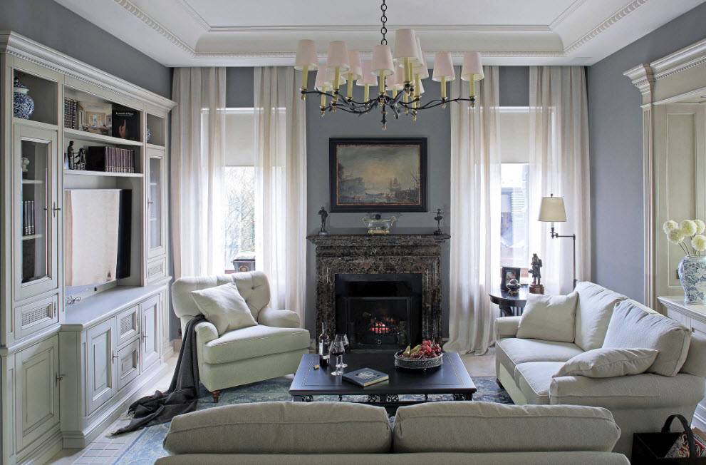 В качестве декора используют резьбу по камню и лепнину, при этом важно, чтобы площадь гостиной составляла не менее 25 квадратных метров. Кроме того, в таком помещение должно быть не менее двух окон, внутреннее пространство лучше оформить в светлой цветовой гамме, дополним аксессуарами с зеркалами и глянцевыми поверхностями