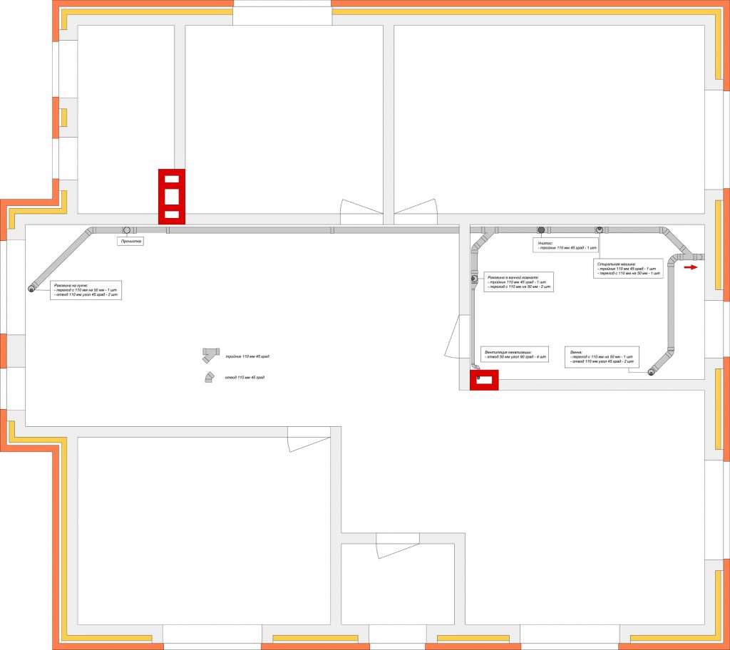 Избежать образования затора можно также сокращением количества изгибов. Именно для этого и необходимо предварительное проектирование. На данном этапе можно пересмотреть направление и количество примыканий, что позволит снизить возможность засорения.