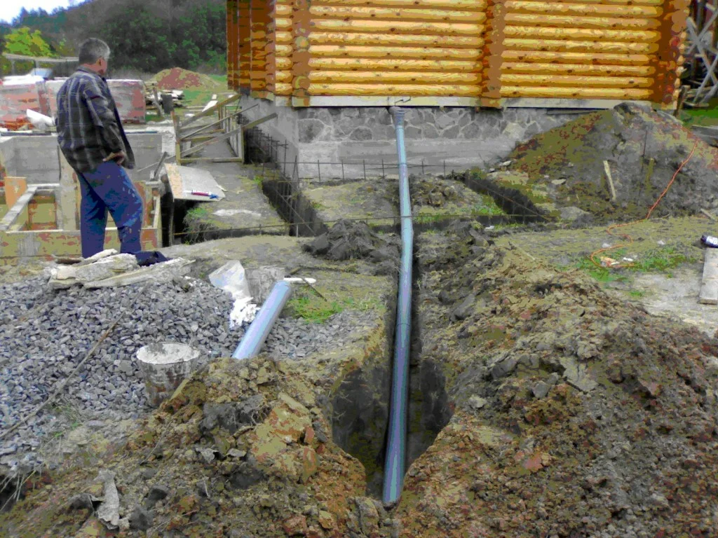 Для повышения эффективности слива при монтаже канализации в частном доме прокладывать трубы в траншее необходимо с уклоном. Глубина рва для каждого случая разная, в зависимости от размеров участка и его расположения относительно подъездных путей.