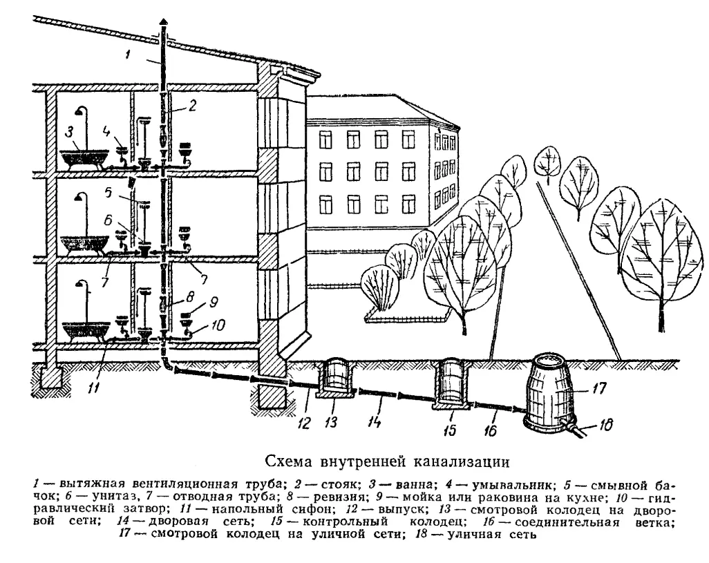 Схема канализации в доме обычно привязывается к плану помещения. В нее должны входить главные составляющие конструкции: