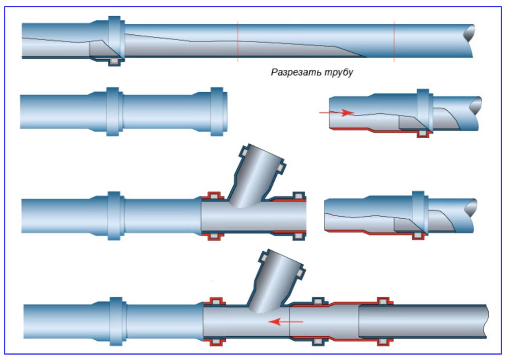 Обрезают и демонтируют фрагмент одной из труб в рабочем канализационном трубопроводе. Заранее подберите трубу или две так, чтобы ревизия вошла между ними и весь узел поместился вместо демонтированной трубы. Затем одну трубу со стороны гладкого конца ревизии вставляют в раструб рабочей трубы, если позволяет место, то можно ревизию сразу вставить гладким концом в рабочий трубопровод