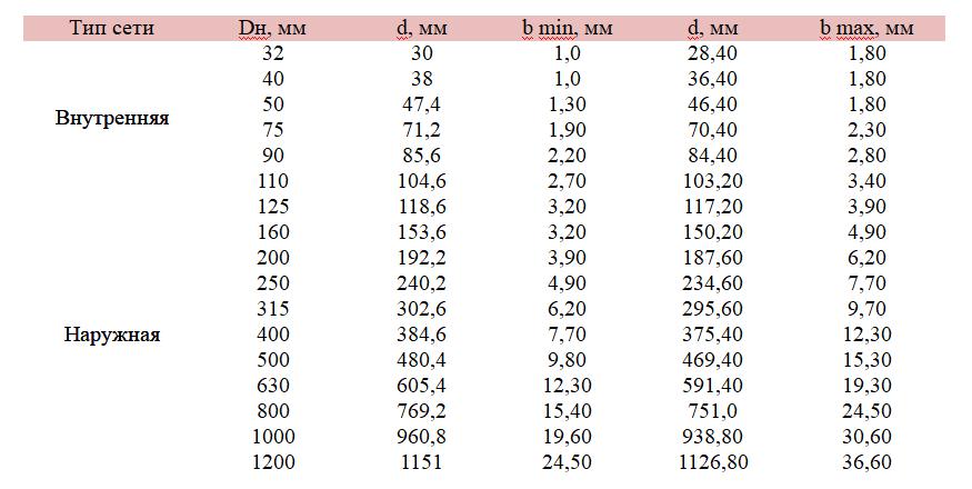 В таблице приведены стандартные размеры ПВХ труб для внутренней и внешней канализации: