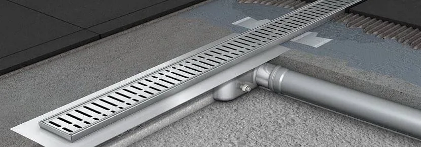- Линейные – длинные и узкие лотки, которые могут монтироваться на выходе из душа, вдоль стен, в одном из углов. Собирают стоки с большой площади, что делает их актуальными для душевых с тропическим душем. Имеют удобную систему монтажа на регулируемых ножках;