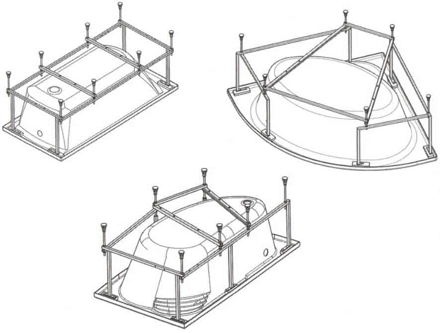 Пример каркасов для акриловых ванн разной формы - Стойки обычно устанавливаются по углам ванны. В этих местах стоят пластины, могут быть отверстия, а может их и не быть — придется сверлить самим. Количество стоек зависит от формы ванны, но не менее 4-5, а лучше 6-7 штук. Сначала стойки просто собираются и ставятся на отведенные им места (пока не крепим).