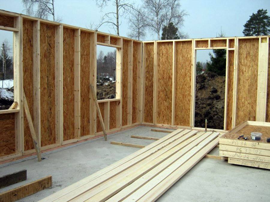 Внешняя отделка каркаса производится с помощью древесностружечных плит, которые впоследствии могут закрываться вентилируемой фасадной отделкой.