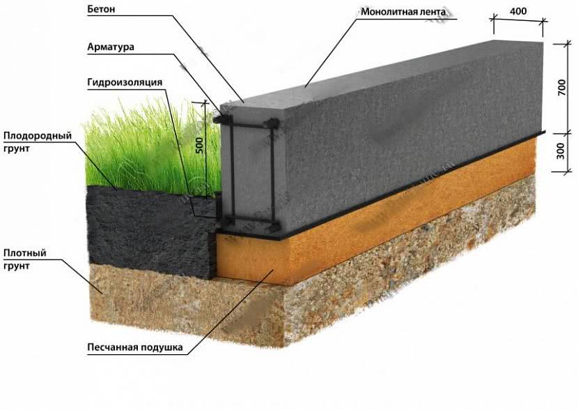 Ленточный фундамент устраивается подобным образом, но без свайных конструкций. Достаточно вырыть канаву по периметру здания и под несущими конструктивами на глубину до полуметра. Далее отсыпается дренажный слой, устанавливается опалубка и гидроизоляция. Арматуру вяжут в соответствии с чертежами из проекта. Теперь приготавливают бетон не ниже класса В15 (М200) и заливают в опалубку, которая может быть съемной и несъемной