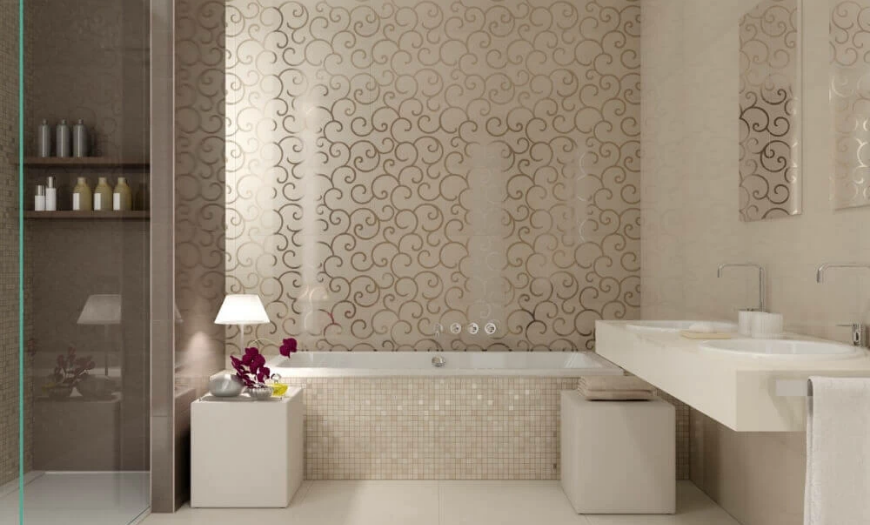 Современный дизайн санузла предполагает использование традиционной керамической плитки. Её кладут на пол и стены. У отделочного материала есть масса преимуществ: