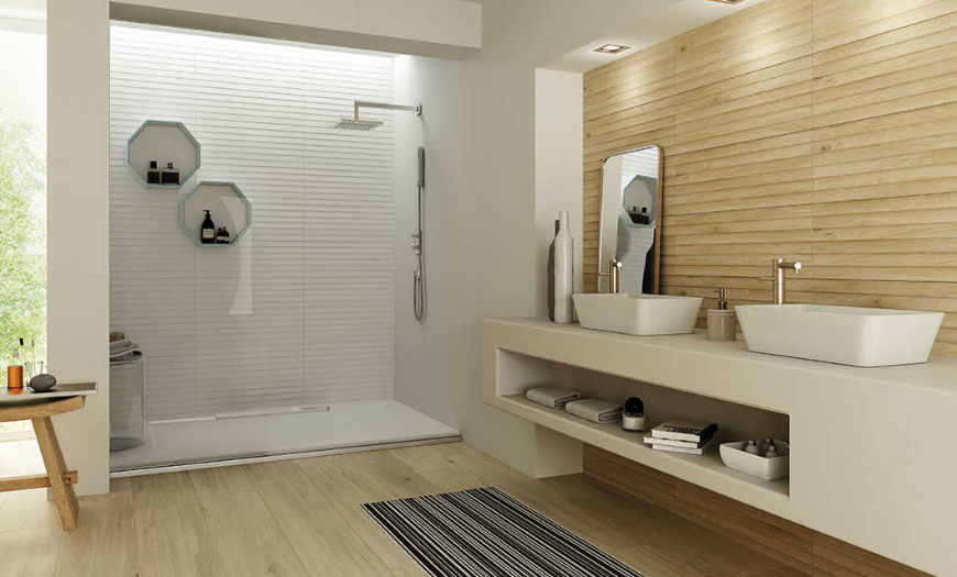 Современные стили дизайна хорошо сочетаются и между ними нет чётких границ. Наиболее актуальные варианты плитки — имитация дерева, камня, бетона. Даже двух видов такой плитки достаточно, чтобы разделить ванную на зоны.