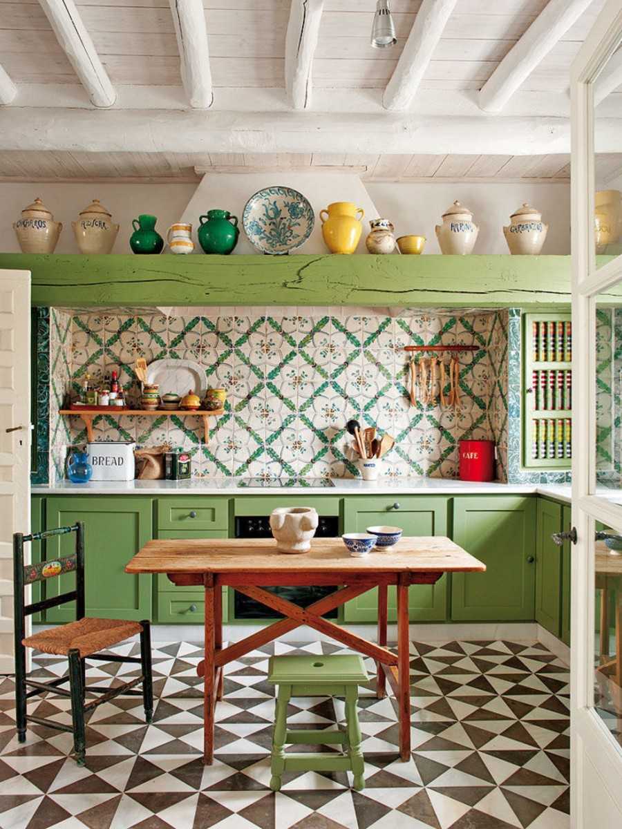 - Для прованского стиля. Деревенский интерьер, в отличие от хай-тека, предполагает использование интерьерной «мишуры». Яркий и необычный рисунок плитки на полу на кухню создаст в помещении ощущение умиротворенности и «подглядывания» за бытом буржуа.