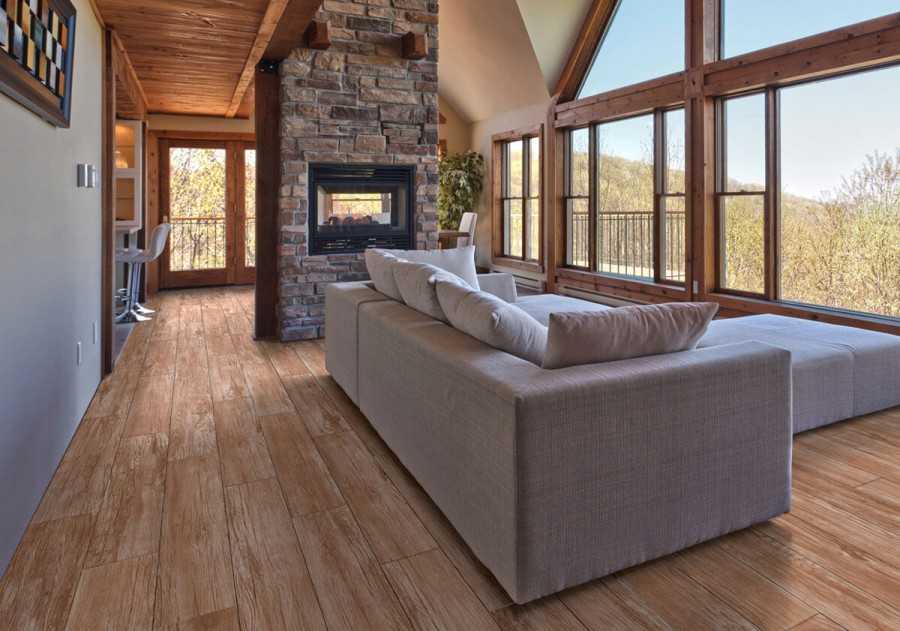 Каменная напольная плитка коричневого оттенка гармонично вписывается деревянным интерьером