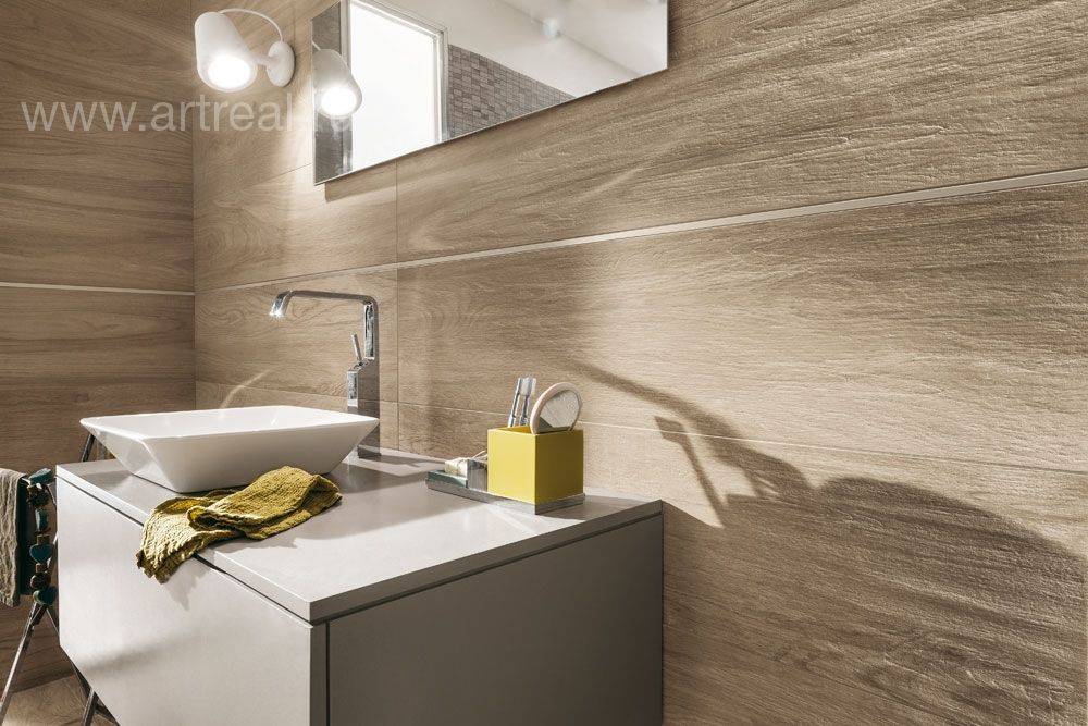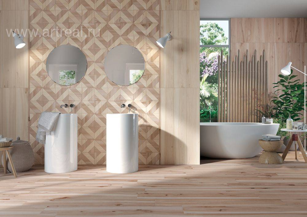 Многие люди питают склонность к натуральным, природным материалам. Поскольку в ванной комнате невозможно использовать натуральное дерево, деревянная плитка — идеальное решение. Можно поэкспериментировать с формой плитки «под дерево»: сделать пол, имитирующий паркет или просто доски.