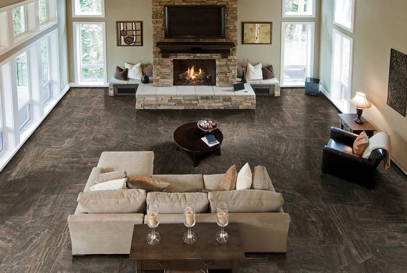 Кварцвиниловая. Современный отделочный материал, влагостойкий и пожаробезопасный. Плюсом является ударопрочность, износостойкость, отсутствие запаха. Минус – специфическая укладка: мягкая плитка требует идеального основания. Покрытие деформируется и разрушается при нагреве; критическая температура 50°C.