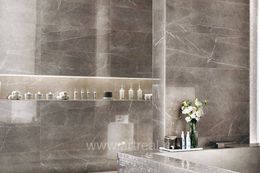 Для интерьера с современным, минималистским характером идеально подходит плитка, имитирующая необработанный бетон. Однако это не исключает художественно включенного декора стен — он не нарушает гармонию, но придает интерьеру уютный характер.