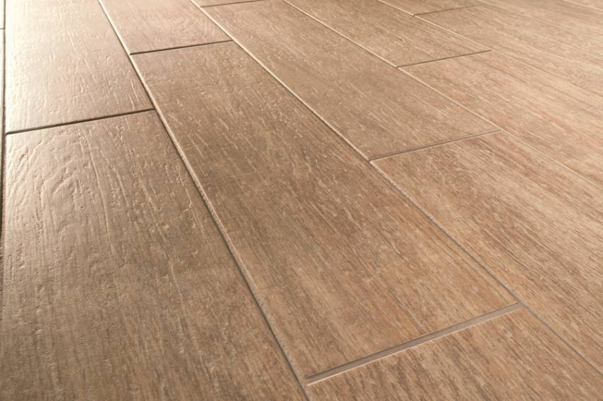 Керамогранит для пола под дерево по своим техническим и эксплуатационным показателям немного превосходит изделия из керамики. Для его изготовления используется высокосортная белая каолиновая глина, кварцевый песок, оксиды металлов редкоземельных и красящие компоненты. Лицевая поверхность керамогранитной плитки может быть матовой, шероховатой или полированной, которая имитирует не только фактуру и цвет любой породы дерева, но и радиальный или тангенциальный распил.