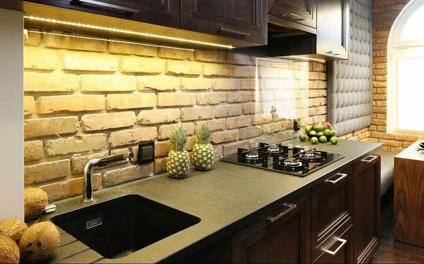 Декор не требует от человека профессиональных навыков штукатура или каменщика. Внешне кухня под кирпич выглядит более эстетично, чем оголенная стена. Сырье не боится механических повреждений, устойчиво к воздействию высоких температур и влаги. Для отделки внутренних помещений выпускают два вида плитки: