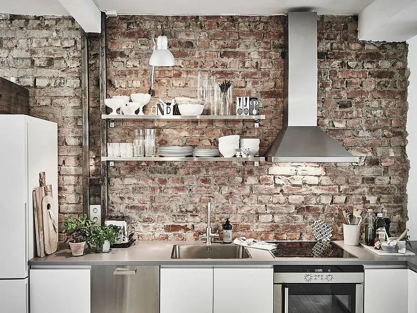 Декоративный кирпич в интерьере кухни из гипса внешне напоминает настоящую кладку. Материал используют внутри помещений для ниш и отдельных деталей. У сырья низкий вес, отличная теплоизоляция и пожаробезопасность. К минусам относят высокую степень поглощения воды и сложность очистки, поэтому облицовка не подходит для фартука.