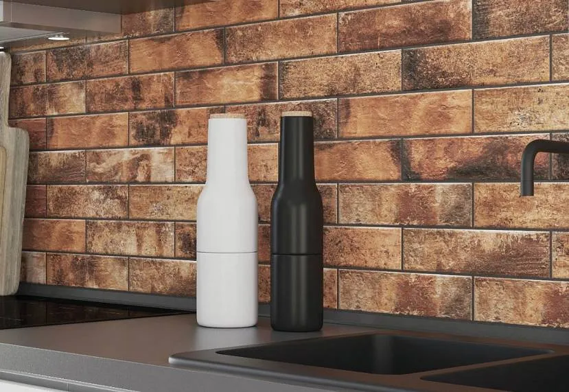 Плитка, имитирующая классический красно-коричневый кирпич, выпускается в нескольких оттенках. Её тон зависит от вида глины, из которой она сделана. Отделка такой плиткой выглядит очень стильно и ярко и позволяет сделать акцент на той или иной зоне помещения. Тёплые оттенки плитки привносят в интерьер тепло и уют. Это наиболее популярный материал для кухни и прихожих.Имитация старой кирпичной кладки. Такая декоративная плитка в виде кирпича отличается от прочих своей рыхлой поверхностью и разнообразными фактурами. Это отличный материал для облицовки каминов и стен вокруг них, кирпич придаёт им красивый вид и вписывается в интерьер даже с самым экстравагантным дизайном.Глянцевый кирпич для кухонных фартуков – материал относительно новый и только-только начал завоёвывать рынок. Блестящая поверхность кирпича смотрится необычно и стильно, позволяя добиться интересных эффектов в интерьере.
