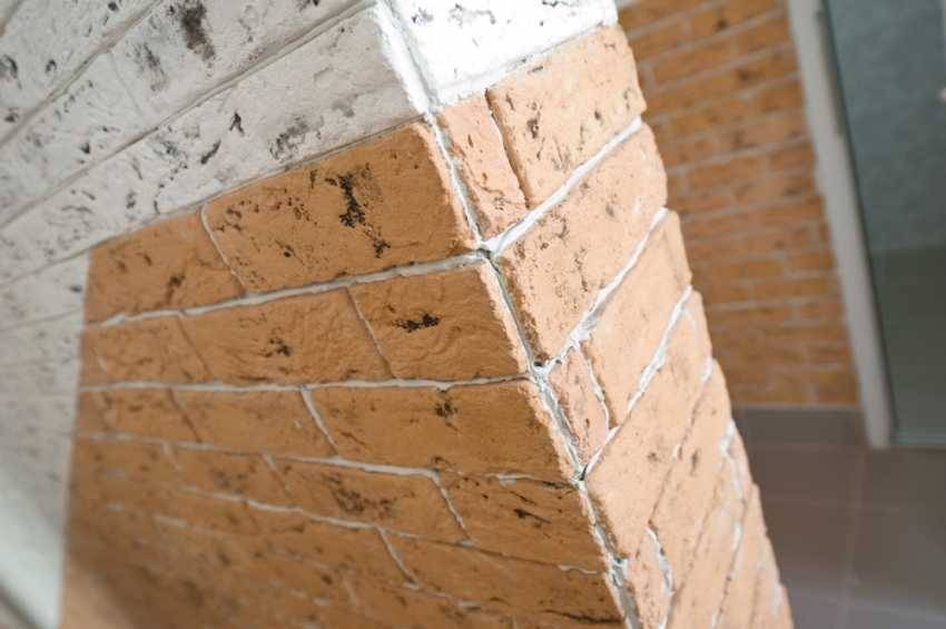 Отделка стены под кирпичную кладку с помощью плитки из гипса.