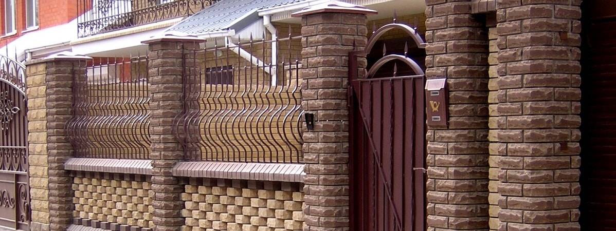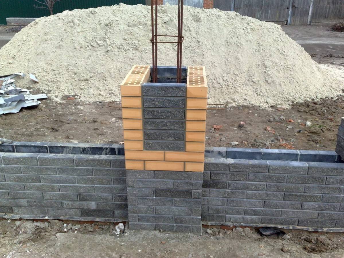 От качества и внешнего вида основного строительного материала зависит половина прочности и эстетичности готового ограждения. Конструкция кирпичного ограждения подразумевает наличие фундамента, опорных столбов и, собственно, секций ограждения. Для кладки каждого элемента могут использоваться различные типы блоков или один вид.