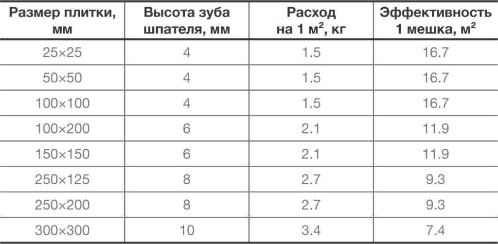 Определить расход клеящей смеси в зависимости от размера плитки позволит таблица . Все данные в ней совместимы с идеальными условиями, при которых пол в помещении ванной комнаты тщательно выровнен. Чтобы обеспечить такой расход клея, требуется наличие профессионального опыта. Расход клея у новичков зачастую увеличивается на 50%.
