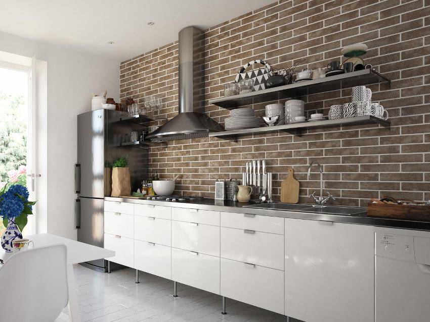 Классический вариант облицовки в виде керамической кладки не теряет актуальности. Она отличается долговечностью и прочностью, используется для оформления интерьеров гостиной, кухни, ванной и прихожей.