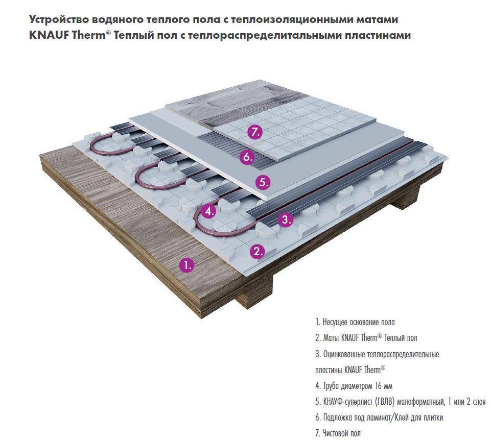 В качестве утеплителя для пола компания «Кнауф» предлагает использовать полистирольные плиты: пенопласт. Их укладывают на бетонное основание под стяжку. Далее формируют подложку, укладывают облицовку для пола. Подходит любой материал, твёрдой или мягкой фактуры.