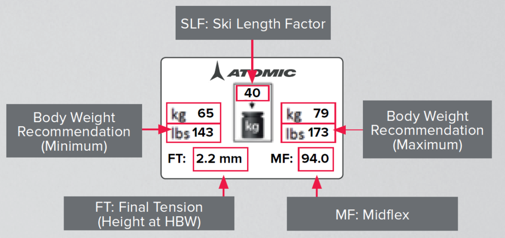 В центре со знаком гирьки пишется усилие в килограммах, которое используется для снятия показателей и фиксировано для каждой длины лыж — SLF. На лыжах с индивидуальным подбором на дополнительном стикере указывается в верхнем правом углу. SLF (Ski length factor) — определенное усилие, которое фиксировано для каждой длины лыж. Оно необходимо для получения показателя FT. Нагрузка прикладывается в 8 см ниже точки баланса.